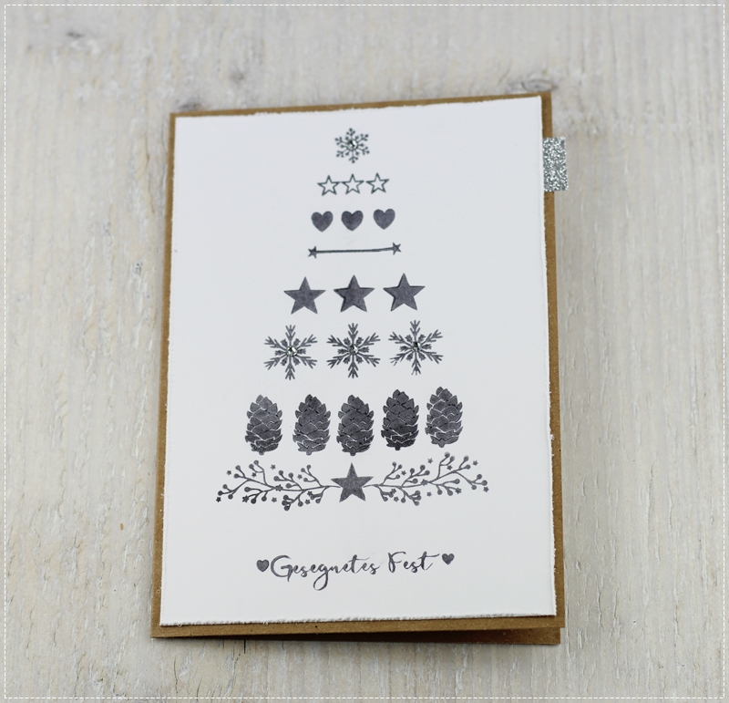 Die zwei Karten heute sind sich vom Stempelmotiv ähnlich und sehen doch anders aus. Einmal schlicht schwarz-weiß-kraft mit ein bisschen Bling-Bling auf den Schneeflöckchen und einmal mit Holzhintergrund. Ohne geht ja irgendwie nicht bei mir... Ich hatte diese Idee im Kopf mit den Washitapes als Weihnachtsbaum, dann dachte ich, so einen Baum kann man sicher auch aus unterschiedlichen Stempelmotiven gestalten.... Alle Stempel sind wie gehabt aus dem